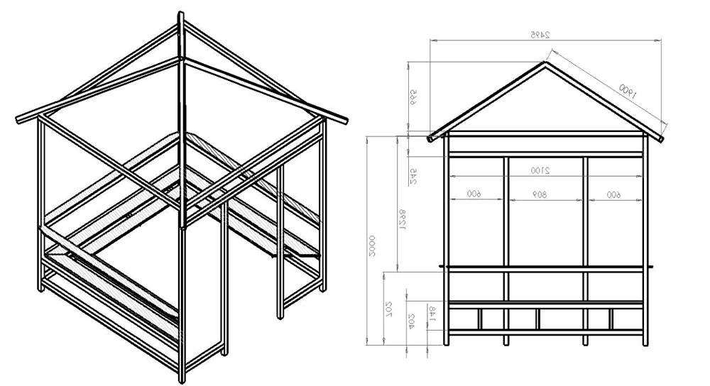 | Устанавливаем вертикальные опоры, скрепляем их между собой поперечными брусьями и делаем верхнюю обвязку столбов. Далее на готовый каркас монтируем двухскатную крышу. | |