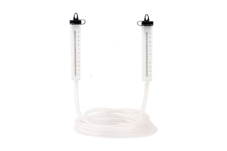 - Гидроуровень. Он состоит из пары колб, соединенных трубкой. Используется для измерения и переноса отметок между плоскостями на большом расстоянии при строительстве зданий. Сообщающиеся сосуды дают погрешность в три миллиметра.