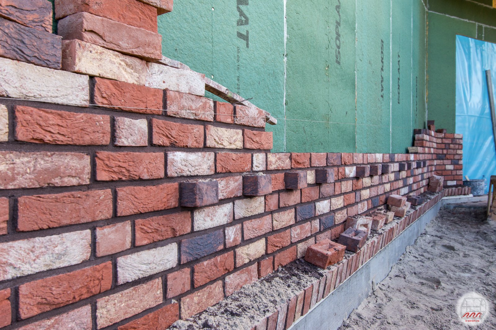 Кирпич. В качестве материалов используются различные виды кирпича: пустотелы, клинкерный и т. д. В кладке важно придерживаться правила «полкирпича». Кладку. Обкладка стен проводится согласно технологии, в которой материал крепится в первую очередь на гидроизоляционный слой, чтобы исключить риск попадания конденсата. Все ряды необходимо крепить раствором на блочный участок правильно, чтобы перекрывались швы. В строительстве используется укрепляющий металлический пруток. По мере завершения каждого ряда применяется армировка. Для этого используется сетка из синтетического материала шириной не меньше 7 см.