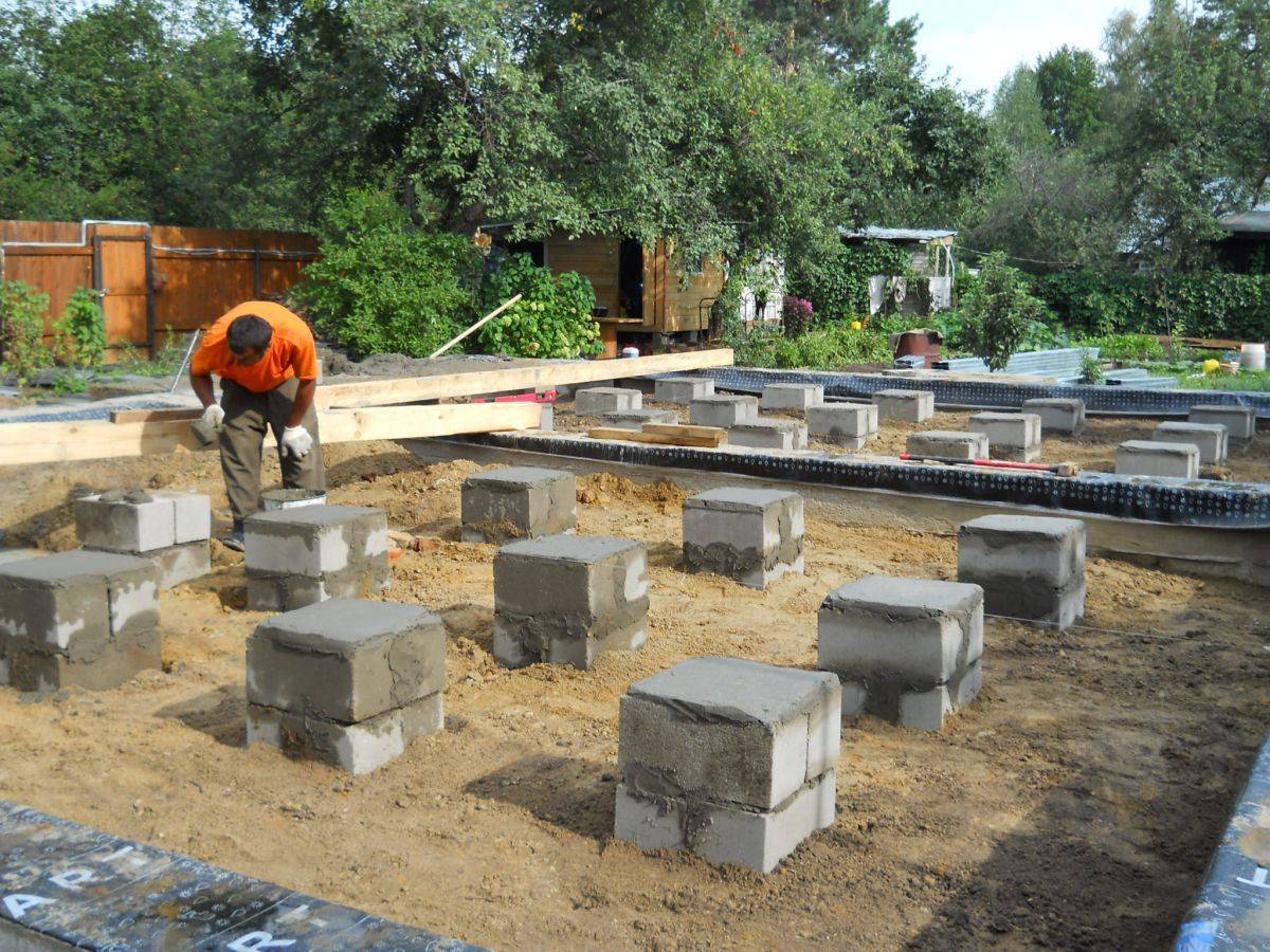 Для столбчатого варианта из кирпича или в блочном исполнении под столбы углубляют траншеи до 400 мм, и делают щебеночную подушку, чтоб исключить капиллярный подсос грунтовой воды. По подушке устраивают гидроизоляцию из рулонного материала. Кладку опорных столбов делают с обязательной перевязкой, габарит столбов и зависит от толщины будущих несущих стен. Готовую кладку обмазывают за два раза битумом или битумной мастикой. Вертикальную гидроизоляцию – отсечку выполняют рулонным материалом. Затем приступают к устройству стен.