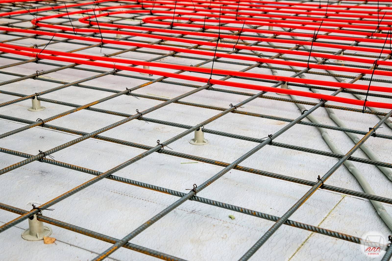 В этом случае фундамент под дом избавлен от сил пучения за счет сохранения тепла недр – глина не замерзает, отсутствуют деформации. При изготовлении монолитной плиты под основанием изготавливаются 4 трубопровода, концы которых одной стороной заходят в плиту, второй выходят за ее периметр. Два из них используются для канализации (рабочая, резервная), два для трубопровода.