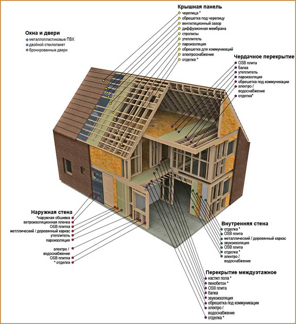 Сутью данной технологии является возведение некоего каркаса из дерева или металлопрофиля, который далее обшивается несколькими видами материалов, мембран, теплоизоляторов и др. Несмотря на то, что сами стены достаточно тонкие, с помощью такого количества разнообразных материалов можно добиться отличного сохранения тепла в помещении.