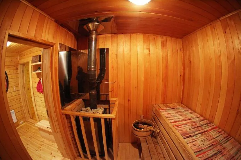 Стены, перегородки и перекрытия делают из бруса 150х100 мм, используется также доска 100х50 мм и 100х40 мм. Вагонка после камерной обработки идеально подходит для обшивки потолка и перегородок. Десятисантиметровые плиты минеральной ваты и пароизоляция в два слоя укладываются под обшивку.
