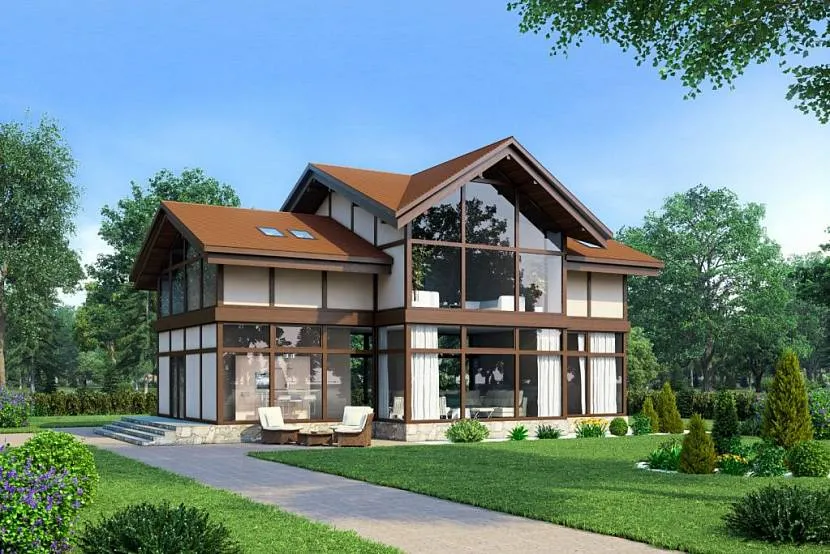 На данный момент необычайно популярны фахверковые дома с панорамными окнами