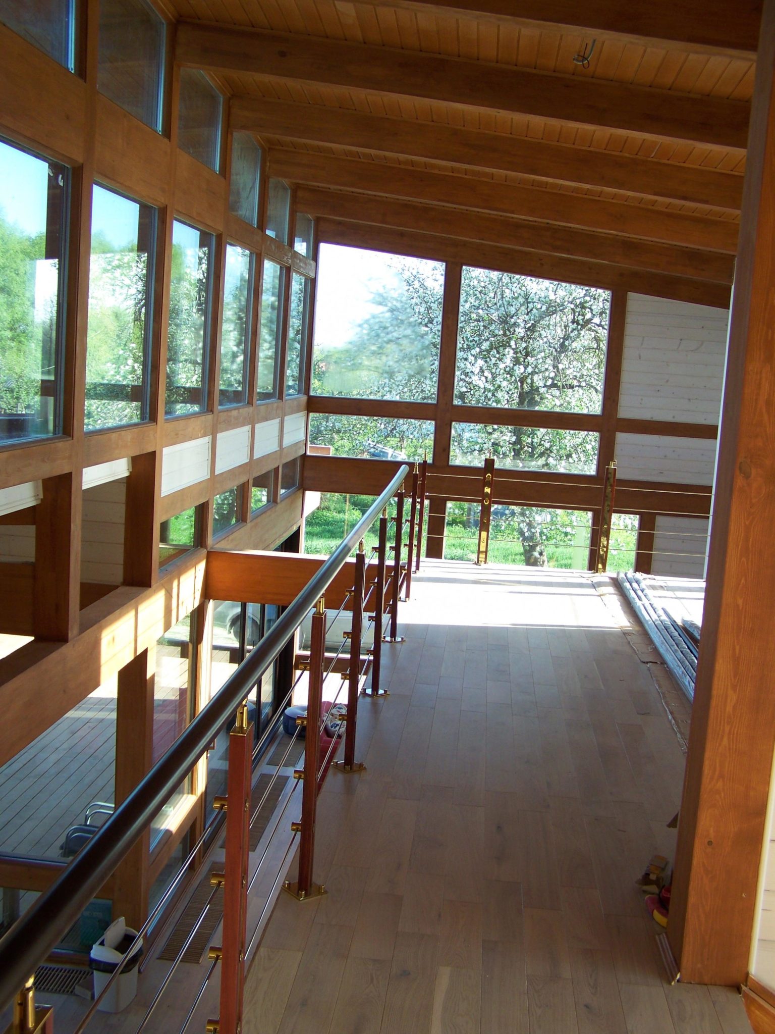 Внутренние перегородки выполняются также из бруса 150х150 мм, прикрепляются дюбелями. Поверх брусьев, расположенных вертикально, устанавливаются продольные прогоны, к которым закрепляются деревянные перекрытия.