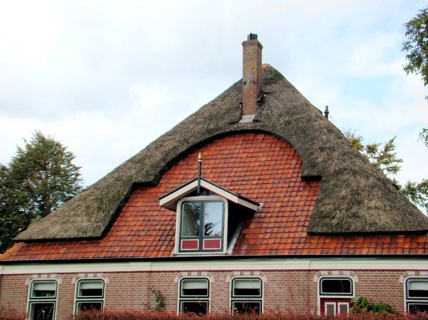 Полувальмовая голландская крыша одновременно относится к двухскатной и четырехскатной конструкции. Она состоит из двух наклонных трапециевидных скатов и двух усеченных треугольных вальм. Маленькие вальмы не заменяют полностью фронтоны, что представляет возможность установить простые вертикальные окна, которые значительно дешевле мансардных. На фото, представленных в сети Интернет, можно увидеть разнообразные проекты домов с четырехскатной крышей данного вида.