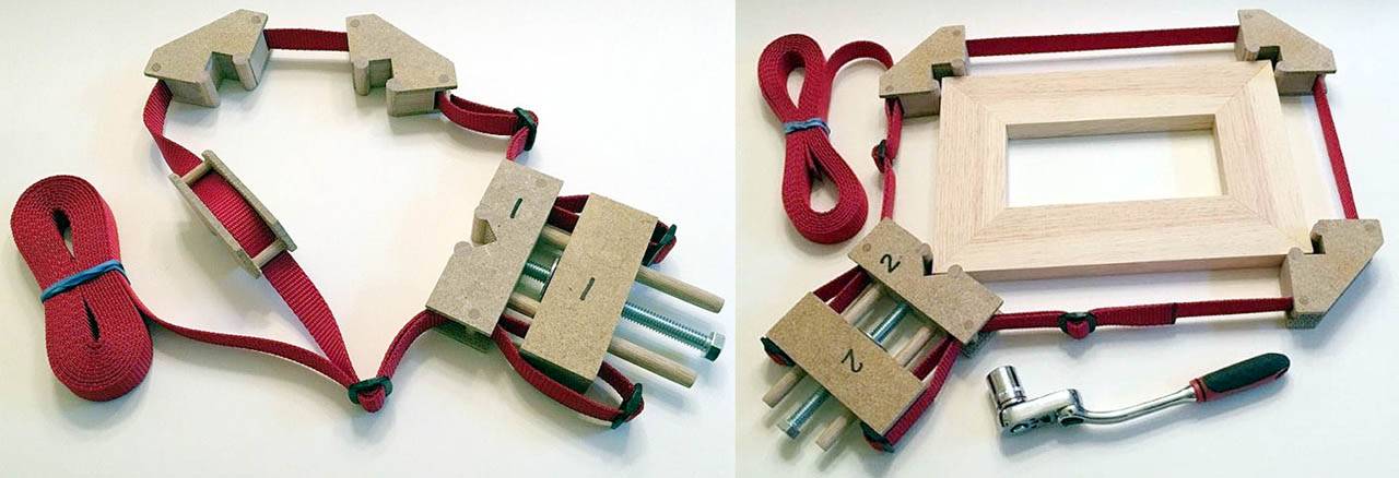 Понадобится для этого прежде всего плоская текстильная стропа и 4 антабки к ней. Угловые прижиму, губка и ползун винтового прижима – из дерева и ДВП, слева на рис. Порядок использования имеет некоторые особенности (между прочим, такие жа и для самых дорогих фирменных).