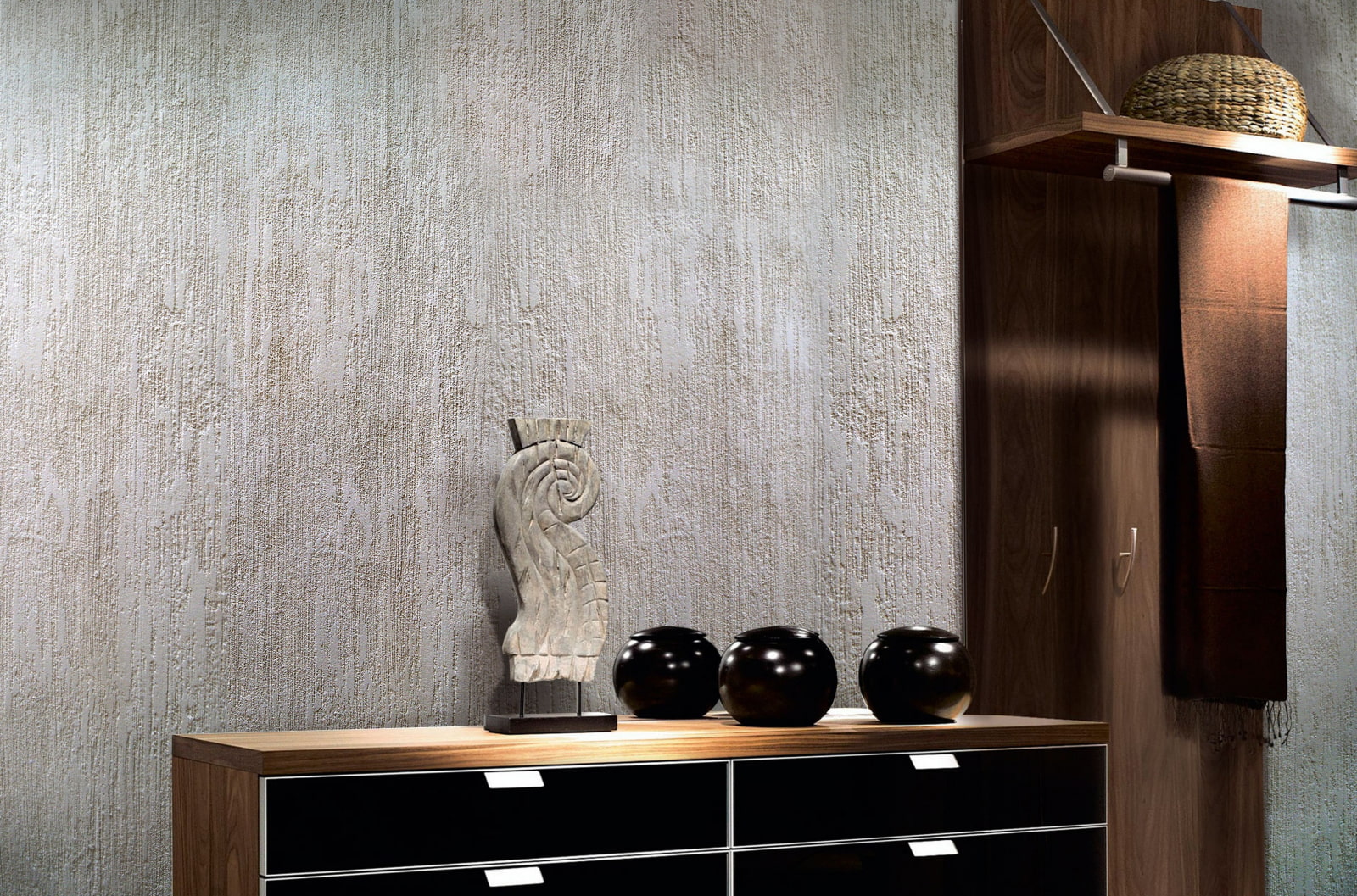 Фактурная штукатурка в интерьере встречается наиболее часто. Она характеризуется высоковязкой структурой. Среди наполнителей встречаются волокна льна, древесина, минеральная крошка и т. д. Можно выбрать любой дизайн декоративной штукатурки: короед, барашек, шуба, мокрый шёлк и пр. Первый вариант отличается бороздчатой фактурой, напоминающей изъеденную жучками древесину. Такой вариант отлично смотрится в интерьере кантри. В спальне будут актуальны пастельные оттенки штукатурки для внутренних работ, а в гостиной целесообразно использовать более тёмные цвета. Подвид материала «шуба» в основном состоит из цемента. После нанесения на стену получается шероховатая поверхность с небольшими ворсинками. Посмотрите, как выглядит декоративная штукатурка «шуба» на фото и насколько выигрышно гармонирует с остальными предметами интерьера.