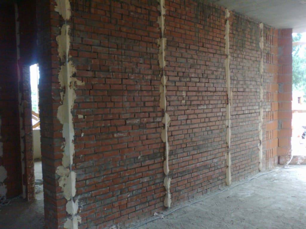 Это основной этап выполнения работы. Для покрытия стены используется густой раствор, а слой должен быть не меньше 10-20 мм.