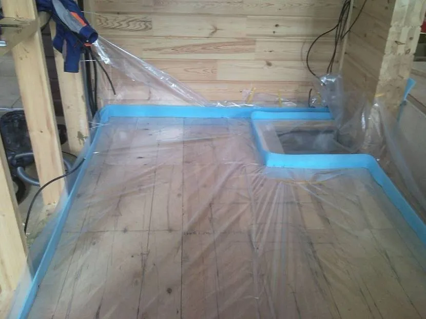 Отсутствие водосодержащих растворов также позволяет сэкономить на устройстве гидроизоляции. Достаточно обеспечить защиту для стяжки от непредвиденного намокания. С этим снизу справляется полотно мембранного типа или техническая плёнка. Покрытие заводят на стены высотой около 15 см. Кромки укладывают нахлёстом 15-25 см, проклеивают для герметизации двухсторонним скотчем или сантехнической лентой.