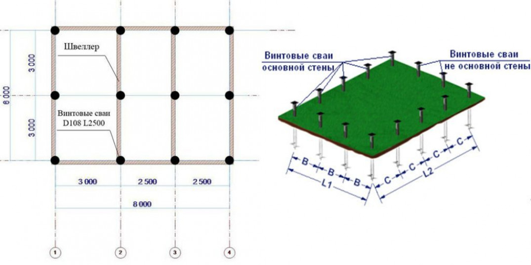 Для частных домов и небольших строений используются, как правило, первые два типа расположения винтовых свай.
