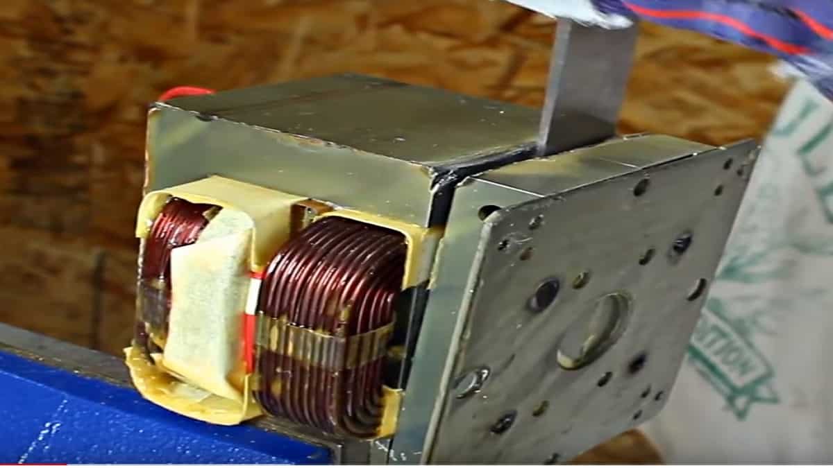 Снижение количества витков необходимо по той причине, что в трансформаторе, извлеченном из печи СВЧ, возникающее напряжение достигает две тысячи вольт. На картинке, сопровождающей данный этап, можно отчетливо увидеть, как выглядит этот самый трансформатор, мы же намерены немного его усовершенствовать. Итак, мы поставили перед собой две цели: