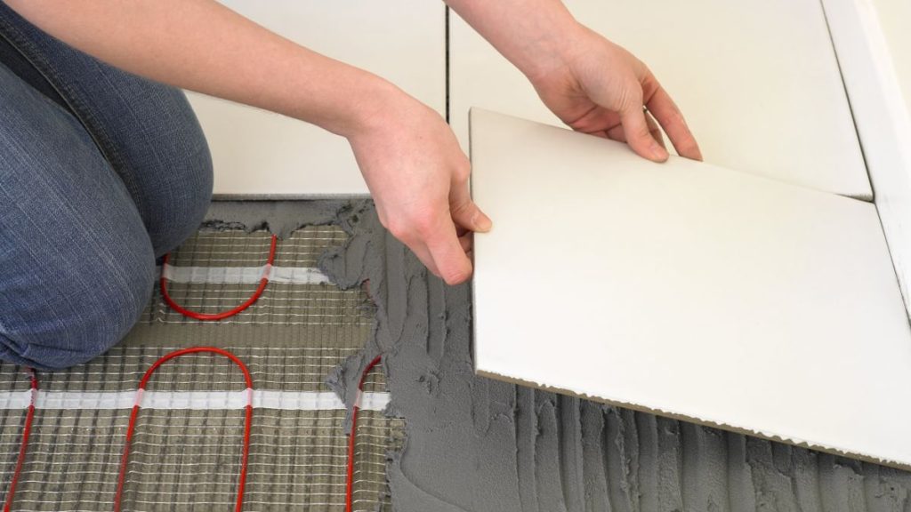 Возможность смонтировать электрический теплый пол без стяжки под плитку обеспечивают вышеупомянутые греющие маты. Они представляют собой модульные конструкции, уже готовые для проведения монтажных работ – это небольшие участки из прочной сетки, на которых закреплены отрезки греющего кабеля. Раскатываем на ровной поверхности, наносим клей, укладываем плитку, даем высохнуть – теперь все готово, можно смело ходить по ней и ставить мебель.