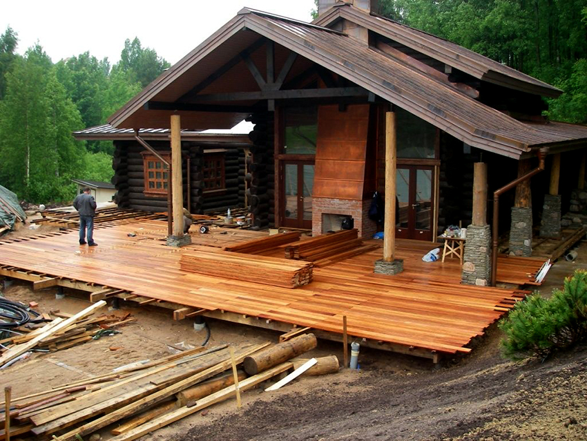 Применяется под капитальные беседки, веранды, летние кухни или когда террасу решено оформлять в форме отдельной площадки. Он прочный, долговечный, может выдерживать высокие нагрузки.