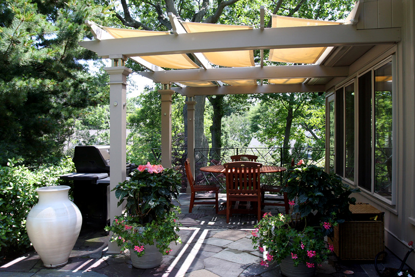 Чтобы построить террасу к дому и придать строению привлекательный внешний вид, нужно грамотно организовать крышу или выполнить навес. Если пристройка примыкает вплотную к дому, то на крыше укладывается такой же материал, как и на основном здании. В случае если терраса вынесена отдельно от здания или отличается внушительными размерами, лучше выполнить двухскатную крышу.