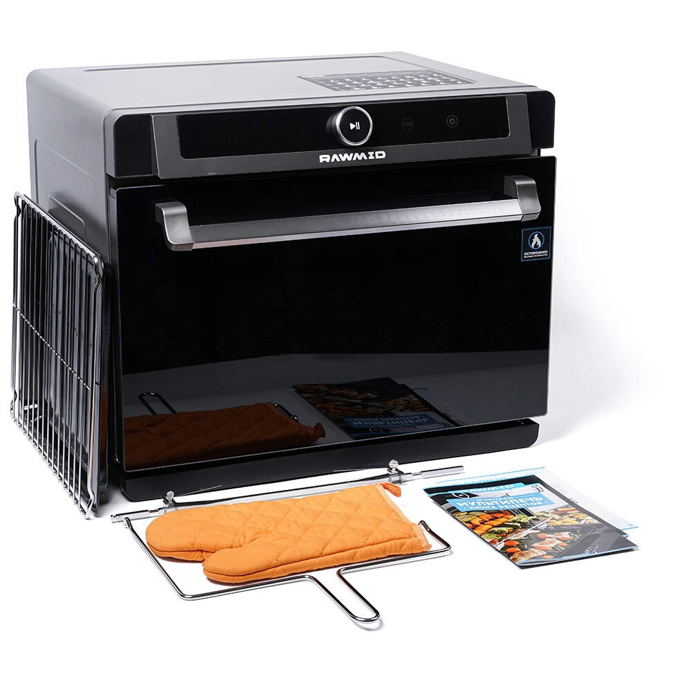 Многофункциональная мини-печь от российского производителя, обладающая сенсорным управлением. Паровая конвекционная печь оснащена более чем 30 режимами готовки, стандартные программы дополнены режимами «гриль + пар» и «аэрофритюрница». Благодаря мощности в 2 400 Вт устройство быстро нагревается и экономит электроэнергию. За качество приготовленного блюда отвечают два нагревательных элемента, работу которых можно сочетать с режимом конвекции. В этой духовке можно готовить с минимальным количеством масла или вообще без его использования, что повышает полезные свойства продукта. В комплект к RAWMID Future RFM-01 входит вертел для равномерного пропаривания или прожарки продукта со всех сторон. Еще одна полезная функция, сохраняющая высокое качество блюд – режим паровой обработки, с помощью которого можно готовить мясо и рыбу, овощи и другие виды продуктов. Благодаря паровой обработке блюда сохраняют свою сочность, яркость вкуса и полезные свойства.