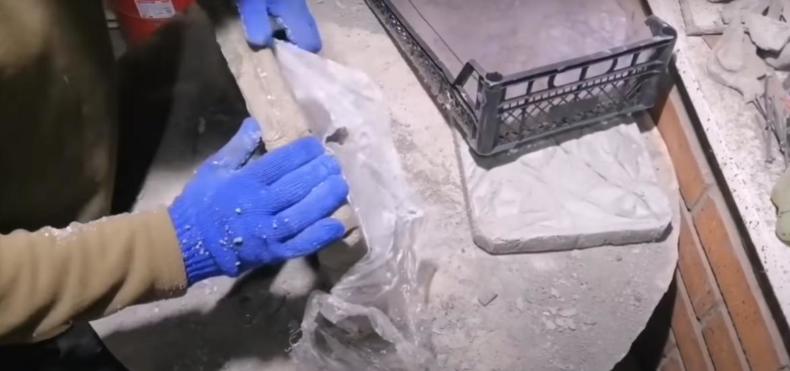 Формы накрывают полиэтиленовой плёнкой, чтобы влага не испарялась быстро. Затем открывают, просушивают немного и вынимают из формы. Плитки раскладываете на поверхности и накрываете снова плёнкой.