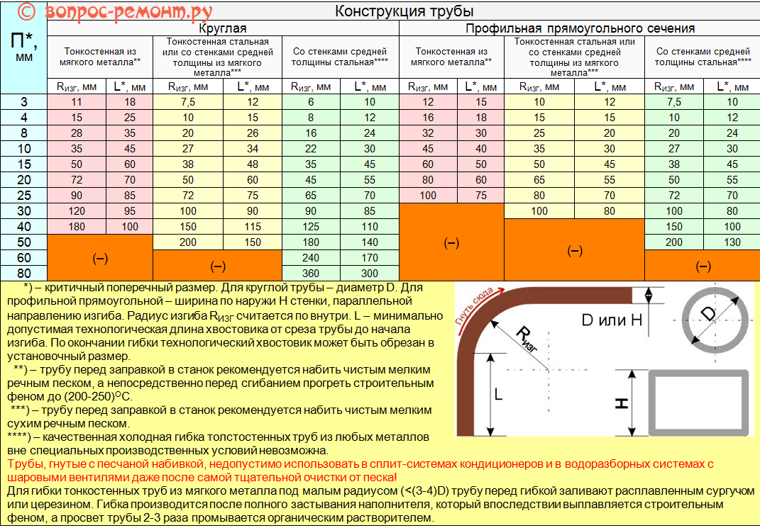 Каждая металлическая труба имеет свой предел упругости, следовательно, радиус гиба нельзя уменьшать ниже определенных значений. Допустимые минимальные радиусы можно взять из соответствующих таблиц.