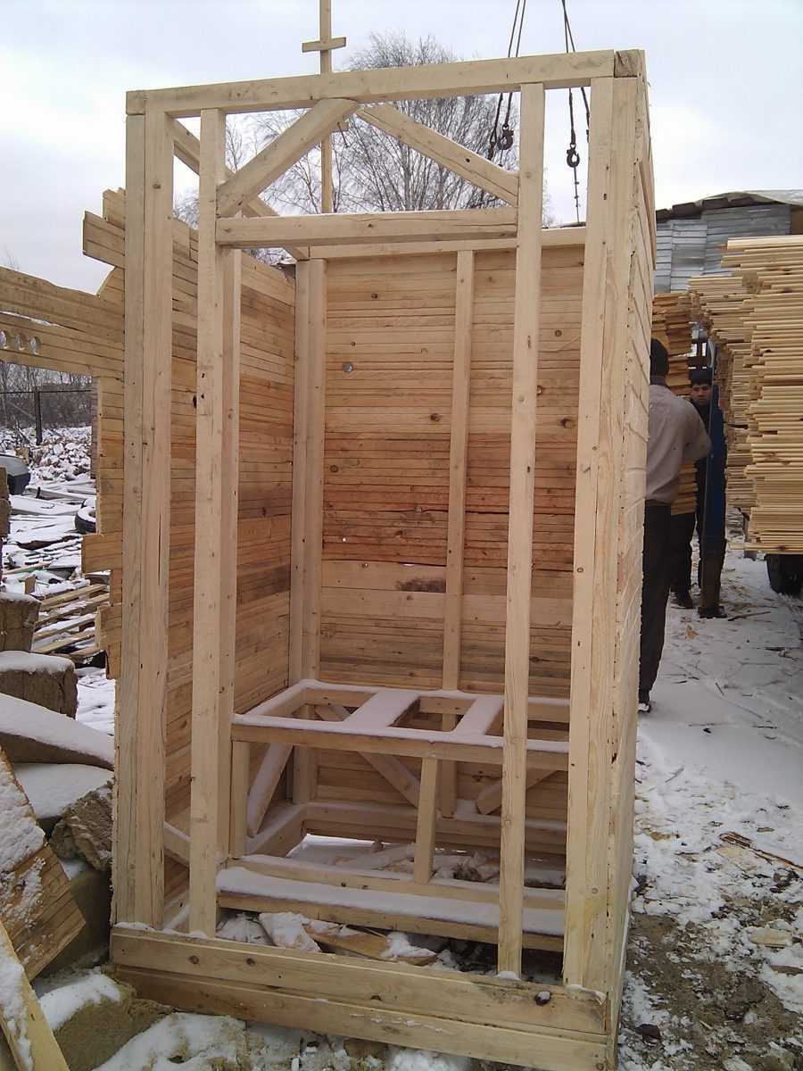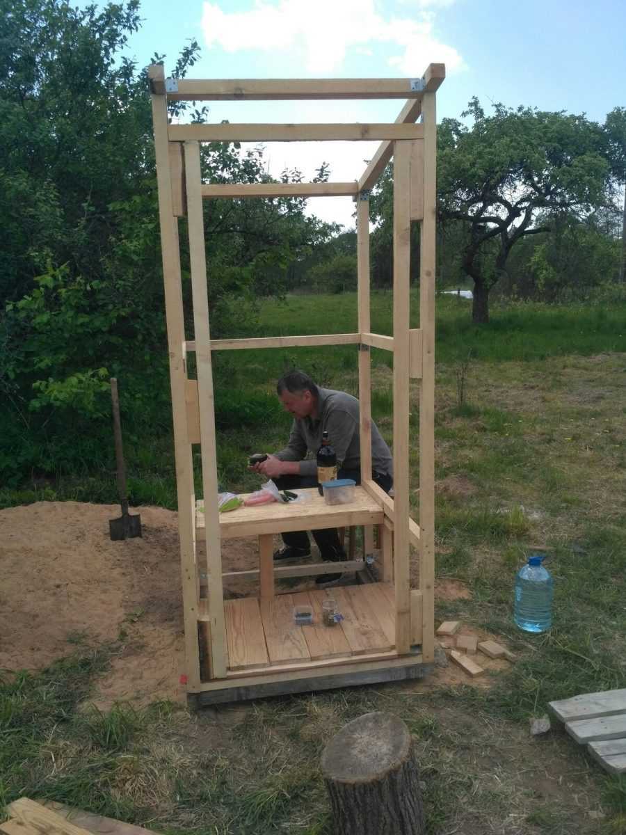 Вот несколько фото процесса изготовления. В оригинале установлен биотуалет, потому постройка несложная: нет необходимости думать о яме и связанных с ней нюансах…но приспособить такую кабинку можно к любому типу…