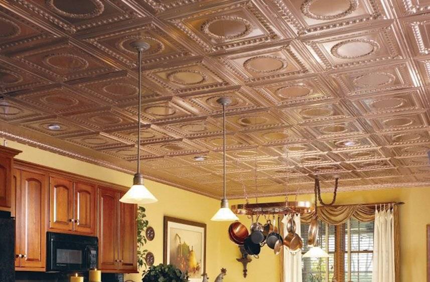 Затем необходимо расчертить поверхность потолок и провести отделку, используя специальный клей для керамической плитки. Металл Выглядит такая плитка очень эффектно. Также она очень долговечна, экологична и пожароустойчива. Использовать ее для отделки потолка в квартире стоит только в том случае, если вы делаете эксклюзивный и дорогой интерьер (высокая стоимость). Металлическую плитку обычно не клеят, а монтируют на металлическом каркасе. Такой подвесной потолок очень долговечен и будет служить верой и правдой долгие годы.
