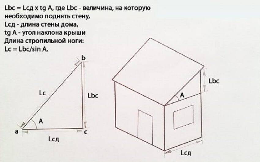 При помощи математического расчёта величину уклона крыши находит следующим образом: