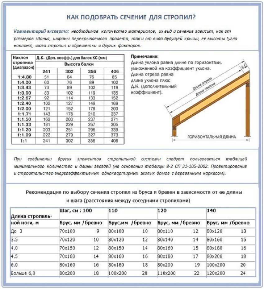 - длина всех элементов стропильной системы и рекомендованное сечение, а также количество стропил;