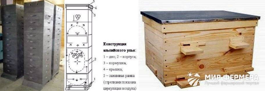 - Альпийский: по конструкции напоминает пирамиду, состоящую из множества корпусов. Именно этот тип максимально воспроизводит естественную среду обитания пчел. Внутри нет перегородок, а вентиляция осуществляется через леток, расположенный внизу. Благодаря тому, что наращивание рамок осуществляется путем установки дополнительных корпусов в вертикальной плоскости, такой вариант пчелиного домика считается достаточно компактным у основания (рисунок 1).