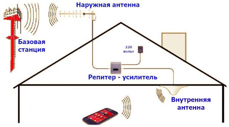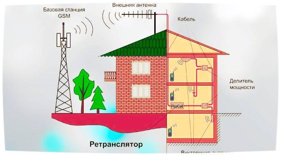 Все репитеры работают по принципу передачи сигнала от базовой станции на внешнюю антенну, выставленную на максимально хорошую волну связи. Далее через кабель сигнал передается на ретранслятор, который усиливает мощность сигнала и передает его на антенну внутреннего оборудования или на разветвитель при наличии нескольких точек подключения к сети.