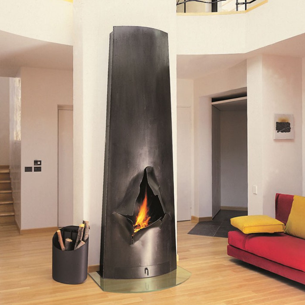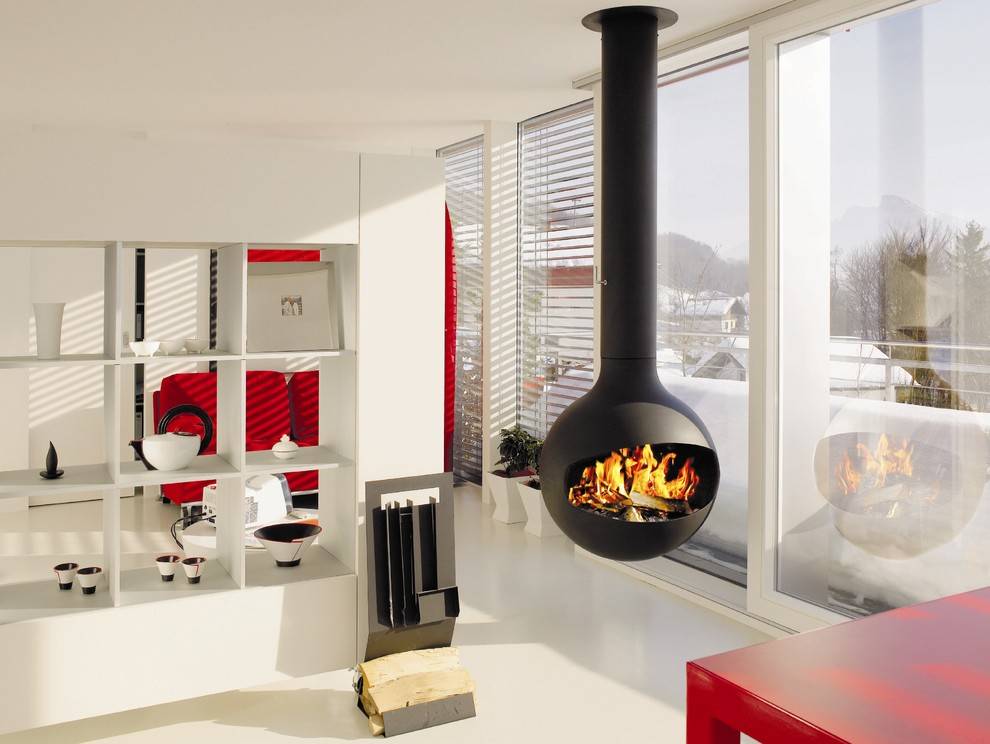 Круглый дровяной камин можно разместить в любой части комнаты