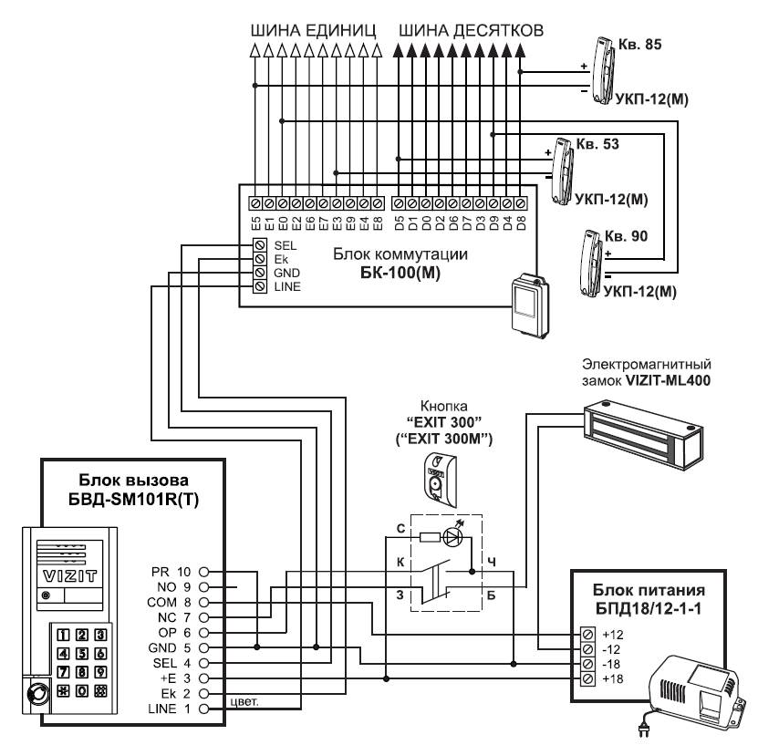 Его используют чаще, так как при поломке прибора у одного абонента система у других будет работать. Подсоединение выполняют по схеме, работающей по принципу телефонной автоматической станции. Обязательно присутствует коммутатор. Для подключения к нему используют 2 шины: на первой контакты соответствуют единицам (Е0…Е9), на второй – десяткам (D0…D9). К примеру, для подключения квартиры №54, нужно минусовой провод подсоединить к клемме E4, а плюсовой – к D5.