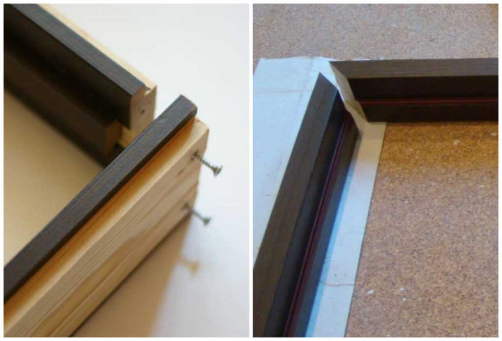 После этого необходимо уточнить размер перекладины по створке с шаблонами, сделать разметку для нее и отпилить лишнюю часть под углом 45 градусов.
