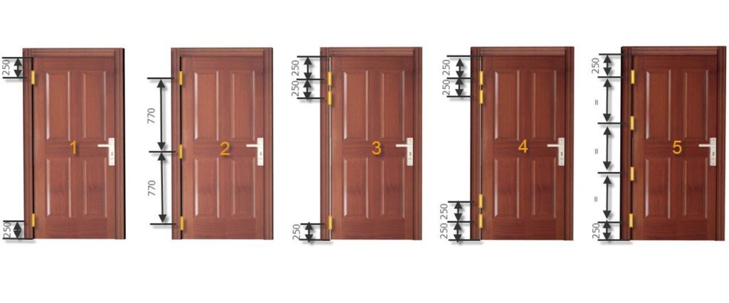 - Два на краях двери (15-20 см от края), и один в центре;