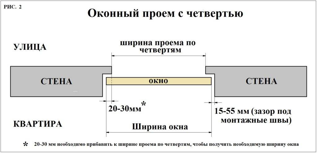 Замеряя окно с четвертью, нужно учитывать, что с двух вертикальных сторон, а также сверху рама окна должна располагаться на четверть (на 15-25 мм), к тому же следует оставлять зазор, что будет заполнен монтажной пеной.