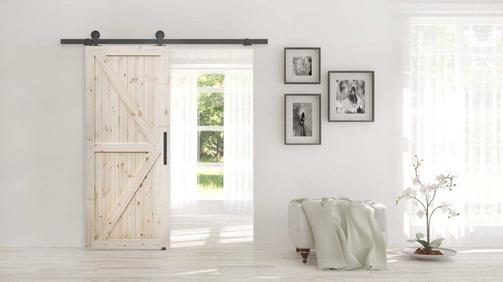 Амбарные полотна. Подходят для помещений в стиле «лофт» или «кантри». Отличаются отсутствием нижней рельсовой опоры, что исключает необходимость устройства порога.