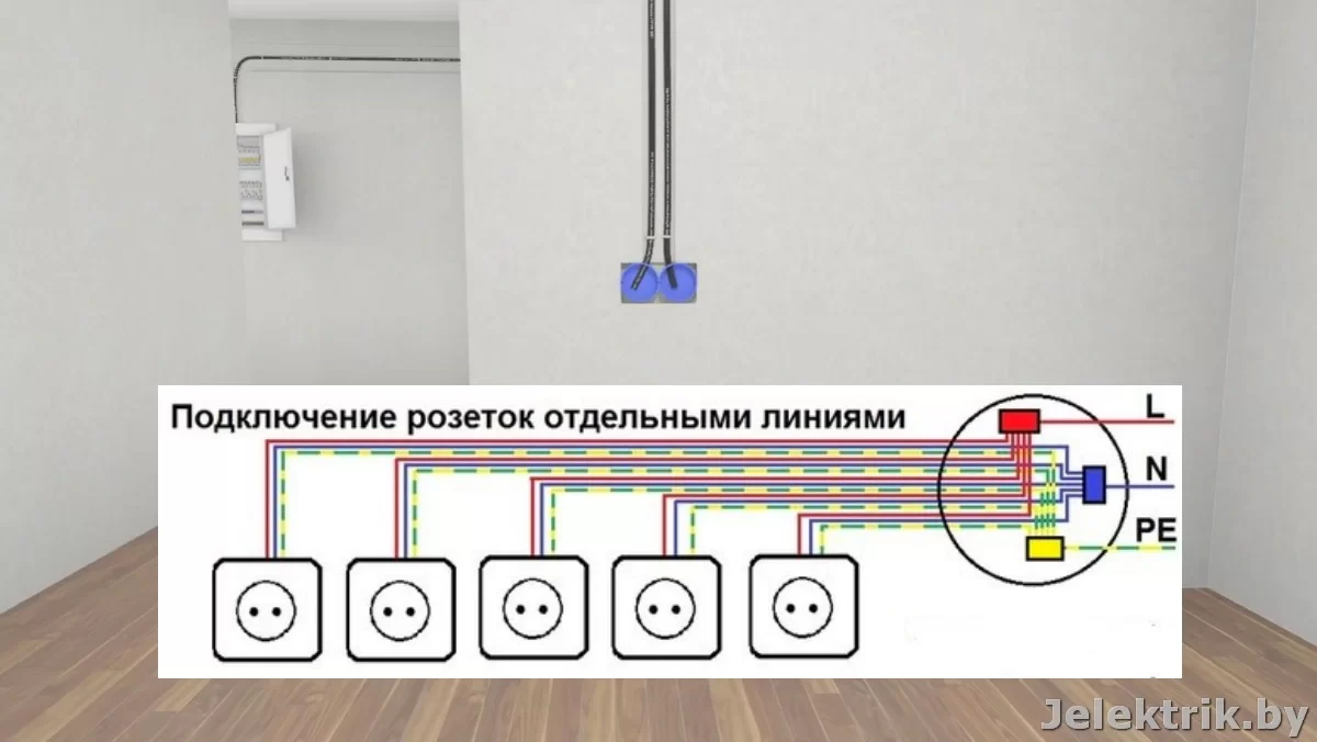 Соединение розеток параллельно от других вариантов отличается наличием отдельной электрической цепи под каждую из розеток. Линии выходит из распределительного щитка и подключается к индивидуальному автомату.
