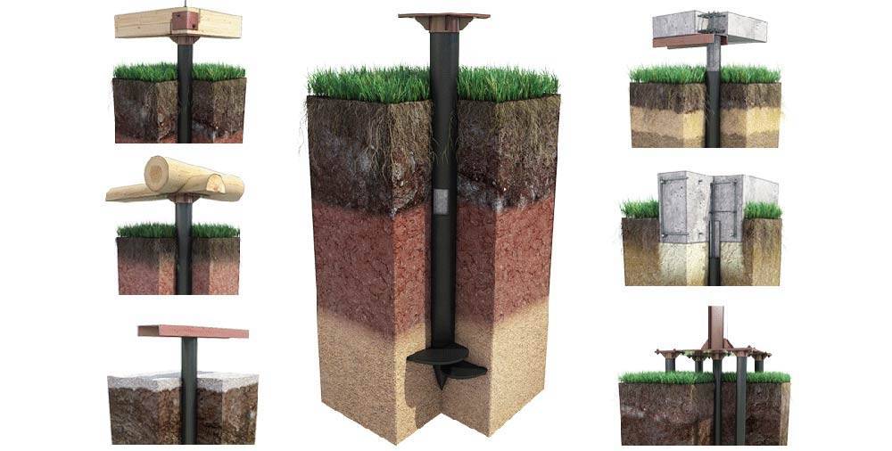 Крайний правый тип крепления разумнее назвать не свайно-винтовым, это, скорее, ленточное бетонное основание, поддерживаемое свайными опорами. Оно уместно в условиях торфяных, болотистых и прочих, склонных к «оползанию» грунтов.