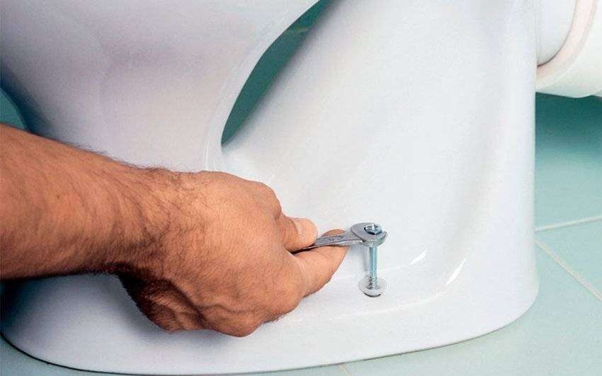 - соответствующим ключом открутить гайки (или болты) крепления основания к полу. Возможно, при установке использовался герметик, тогда придется вооружиться ножом и, пытаясь приподнимать унитаз, приступить к подрезке герметика;