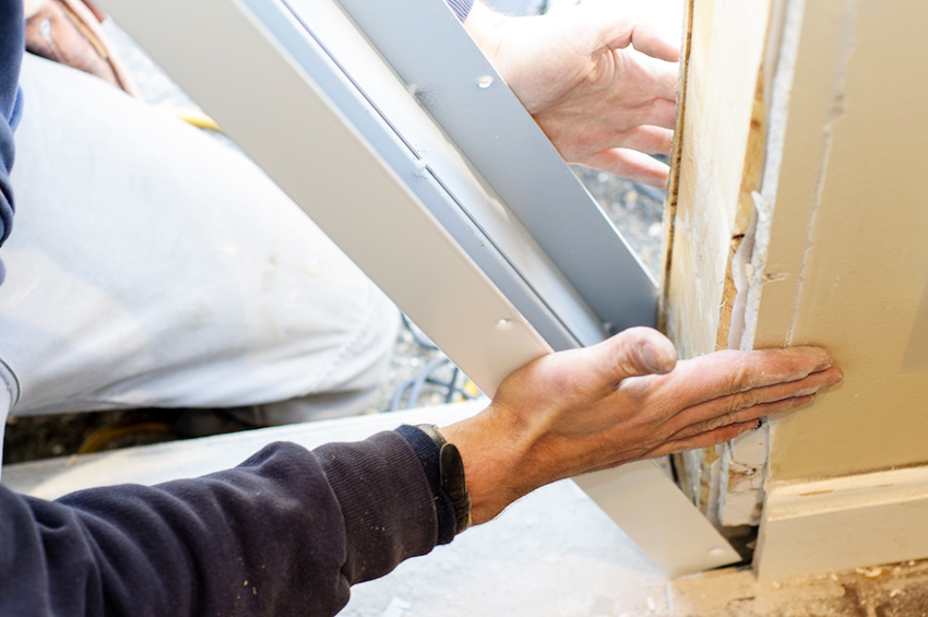 - Сперва от старых материалов освобождается нижняя часть проёма до самого пола, только затем устанавливается конструкция. Убираются: