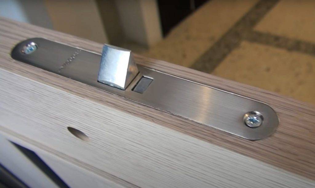 Установка завершается креплением накладки и проверкой плавности движения механизма. Если все сделано правильно, ригель будет беспрепятственно заходить в углубление и фиксироваться за железную планку.