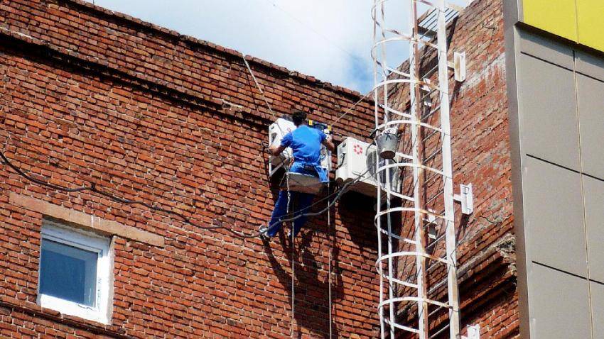 При установке наружного блока кондиционера своими руками на стене рядом с окном, обдумайте высоту его монтажа. Можно расположить верхнюю поверхность блока вровень с верхней кромкой окна. В этом случае, высунувшись из окна и застраховавшись, можно будет проводить работы стоят на подоконнике. Второй вариант — нижнюю кромку выровнять вровень с нижней границей оконного проема. Тут можно будет лечь животом на подоконник, но достать до места выхода патрубков не получится. То есть, все-таки придется вызывать промышленных альпинистов.