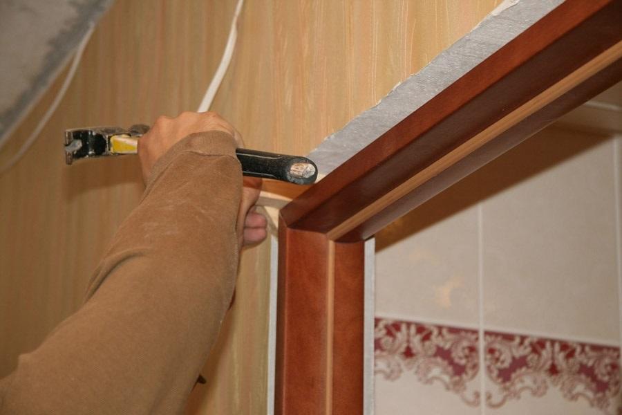 Понадобятся финишные гвозди. На той части торца добора, которая будет контактировать с коробом, высверливаются отверстия с шагом между собой в 20-30 см. Дырки делают на глубину не больше половины длины гвоздя. У последнего кусачками удаляется шляпка. Затем гвоздь помещается в отверстие так, чтобы его острая сторона смотрела наружу.