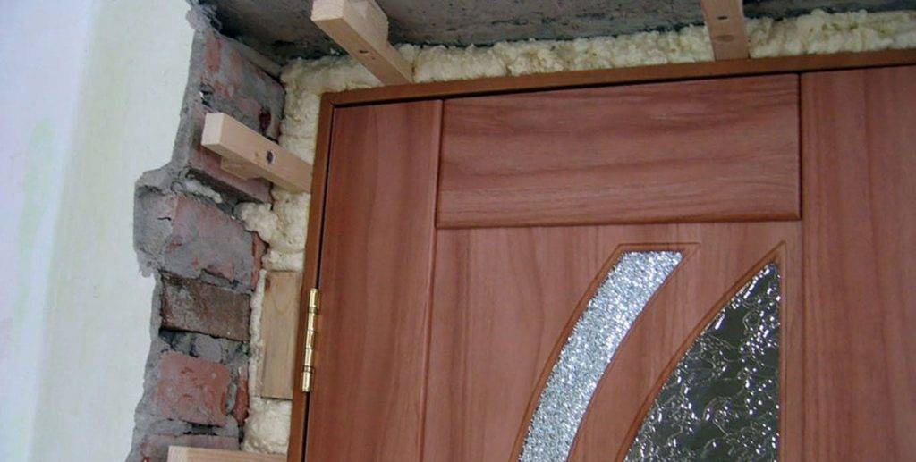 - Если конструкция приняла проектное положение, в монтажные зазоры забиваются клинья до тех пор, пока она не будет жёстко зафиксирована в проёме. Учитывая, что порог для двери устраивается далеко не всегда, неполный прямоугольник может потерять свою форму из-за распорного усилия. В таких случаях следует применить монтажный ригель в уровне нижней части коробки.