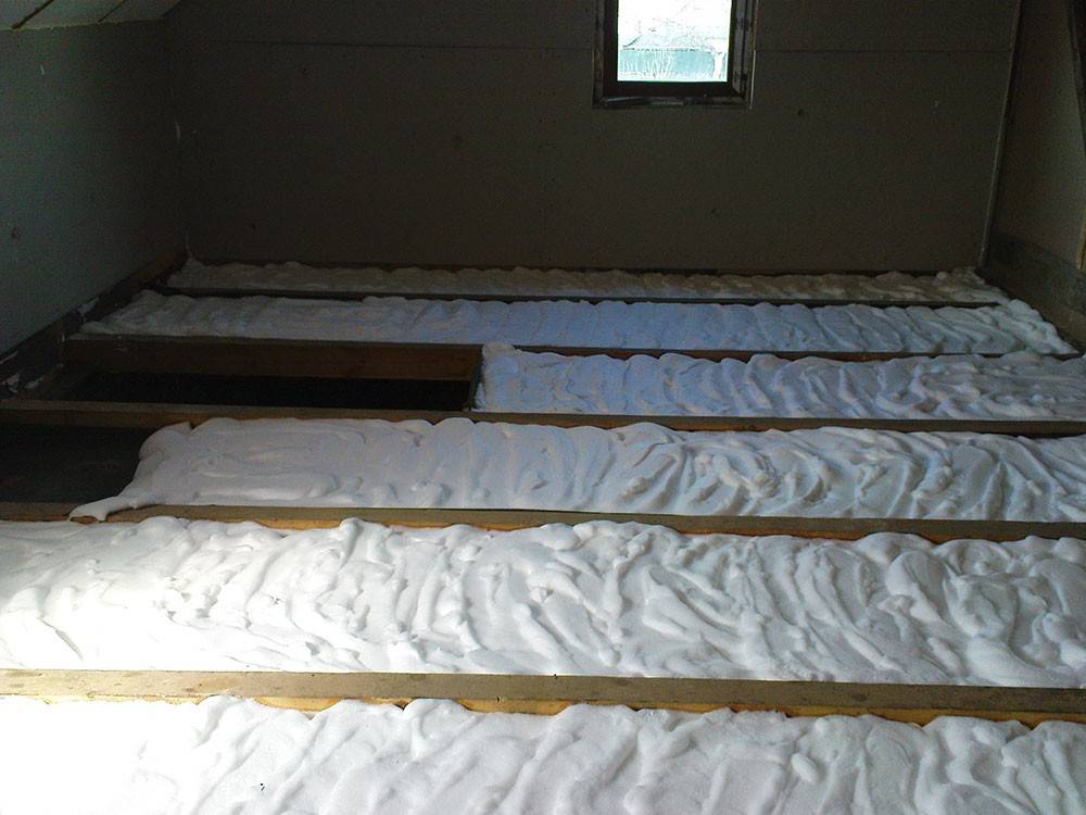 Еще один вариант утепления пола из подвала – напыление жидкого пенополиуретана (ППУ).
