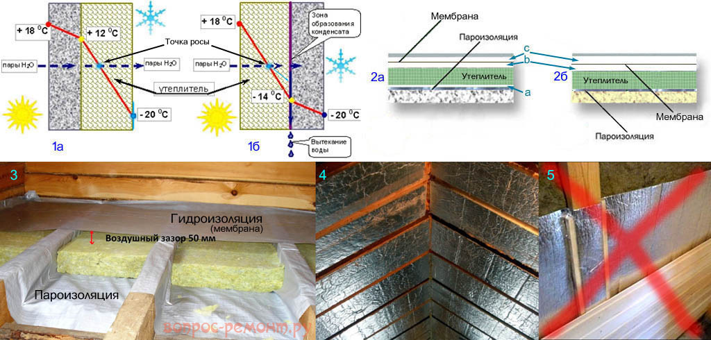 Иногда утеплиться снаружи технически невозможно. Или требуется дополнительное утепление к уже существующему. Аналог – в старину в особо сильные морозы надевали 2 шубы: нагольную мехом внутрь, а поверх нее – мехом наружу. В этом случае, т.е. при утеплении изнутри, его схему разрабатывают такой, чтобы конденсат в утеплителе мигрировал к холодной поверхности, а там стекал в сборник и удалялся или испарялся наружу, поз. 1б. Самый утепляющий материал в этом случае нужен не теряющий изолирующих свойств при увлажнении. Такие существуют, см. далее.