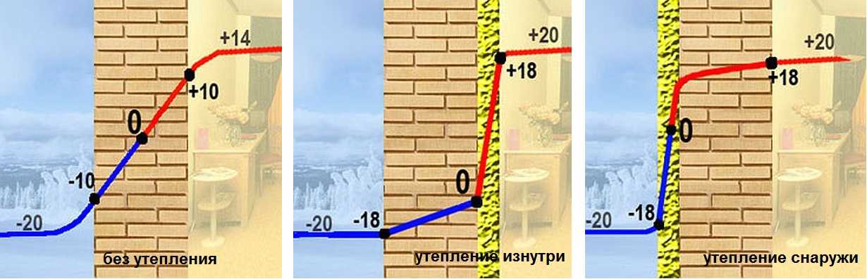 Утепление зданий правильно выполнять с наружной стороны, иначе не избежать конденсации при контакте с холодным фронтом (точка росы). Рассмотрим три типа кирпичных стен: