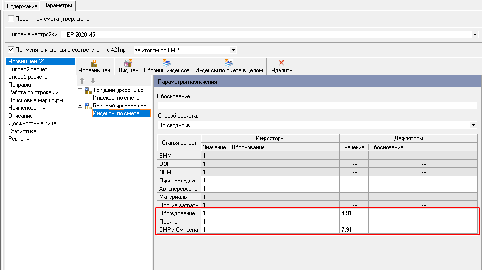 Настройка Применять индексы в соответствии с 421пр позволяет изменить способ расчета в соответствии с Методикой определения сметной стоимости строительства: