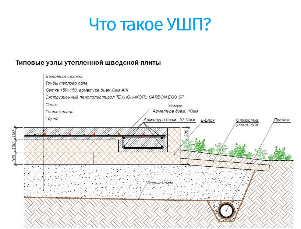Мелкозаглубленный фундамент требует снятия верхнего плодородного слоя почвы не менее чем на 0,5 м, чтобы снизить сжатие грунта. Плиты укладываются на слой из песка. Вес 1 квадратного метра каркасного дома – около 165 кг.
