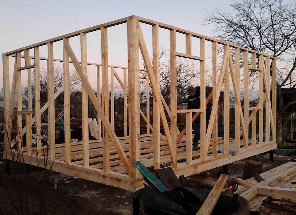 Каркас стен сооружается из бревен, стойки каркаса фиксируются между собой нижней и верхней обвязкой и горизонтальными перемычками, для дополнительной жесткости используются металлические укосины между упорами каркаса.