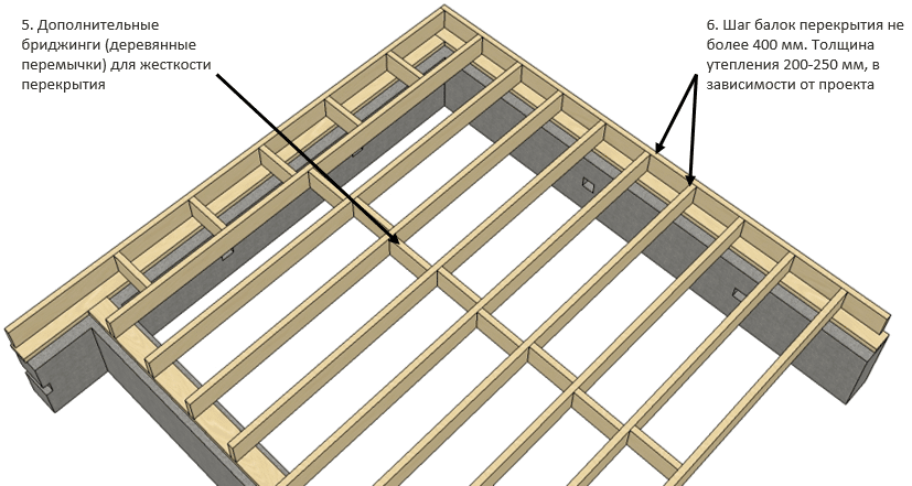 4. Далее монтируются балки перекрытия. Балки выполняются из сухой строганой доски 195*45 мм, с шагом не более 400 мм. Пол Вашего дома будет теплым и надежным, без зыбкости и скрипа. 5. Дополнительные бриджинги (деревянные перемычки) для жесткости перекрытия. 6. Шаг балок перекрытия не более 400 мм. Толщина утепления 200-250 мм, в зависимости от проекта.