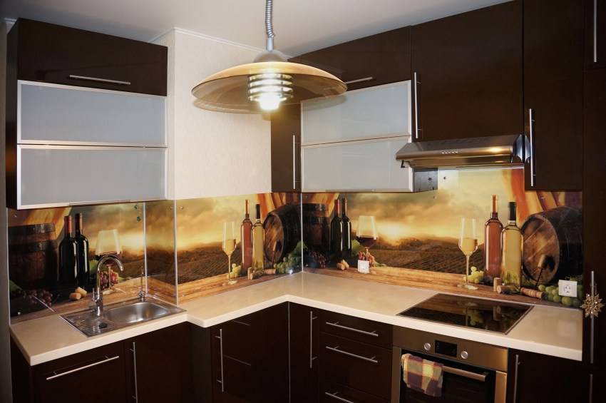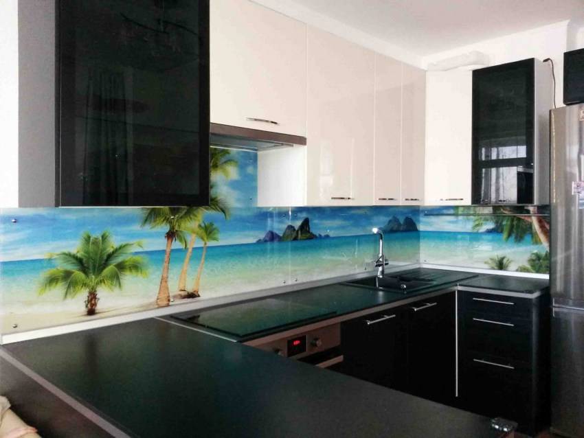 Использование техники фотопечати превратит кухонный фартук в настоящее произведение искусства. Главное – правильно подобрать картинки, соответствующие тематике и стилю интерьера. Индивидуальные проекты, превращающие фартук в яркое панно, сделают кухню неповторимой. Панно с фотографией на плитке или стеклянном полотне устойчиво к высоким температурным перепадам и нейтрально относится к воде. Еще один плюс — с такой поверхности очень просто удалить любой вид загрязнения.